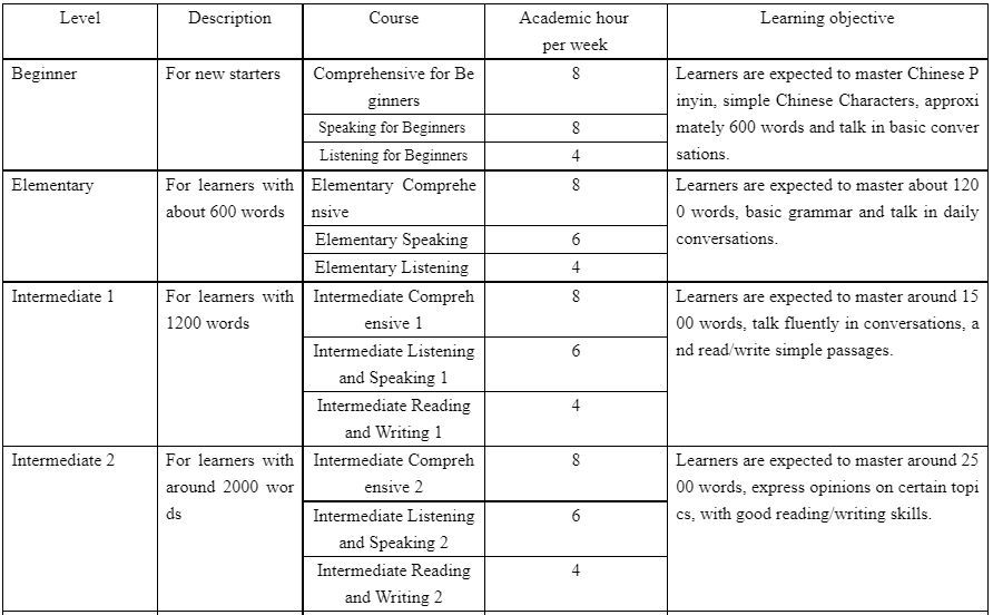(1) Regular language courses: Comprehensive Chinese, Speaking, Listening, Listening and Speaking, Reading and Writing, etc.