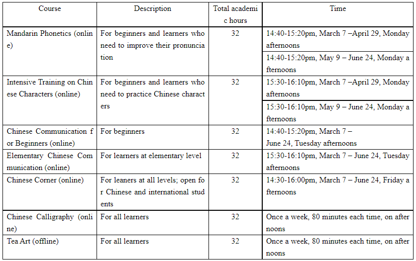 (2) Intensive language courses: Mandarin Phonetics, Intensive Training on Chinese Characters, Chinese Communication for Beginners, Elementary Chinese Communication