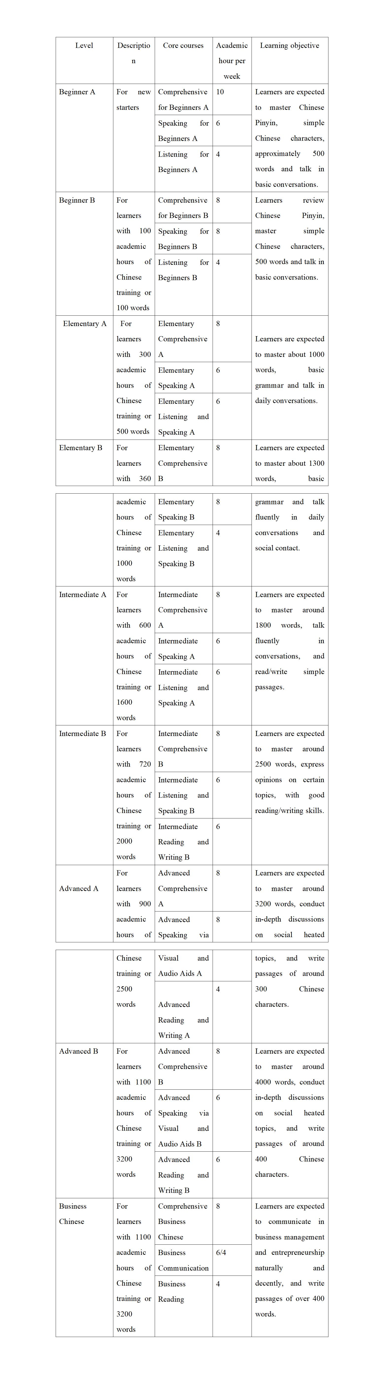 Comprehensive Chinese, Speaking, Reading and Writing, Speaking via Visual and Audio Aids, etc. to be offered based on different levels |