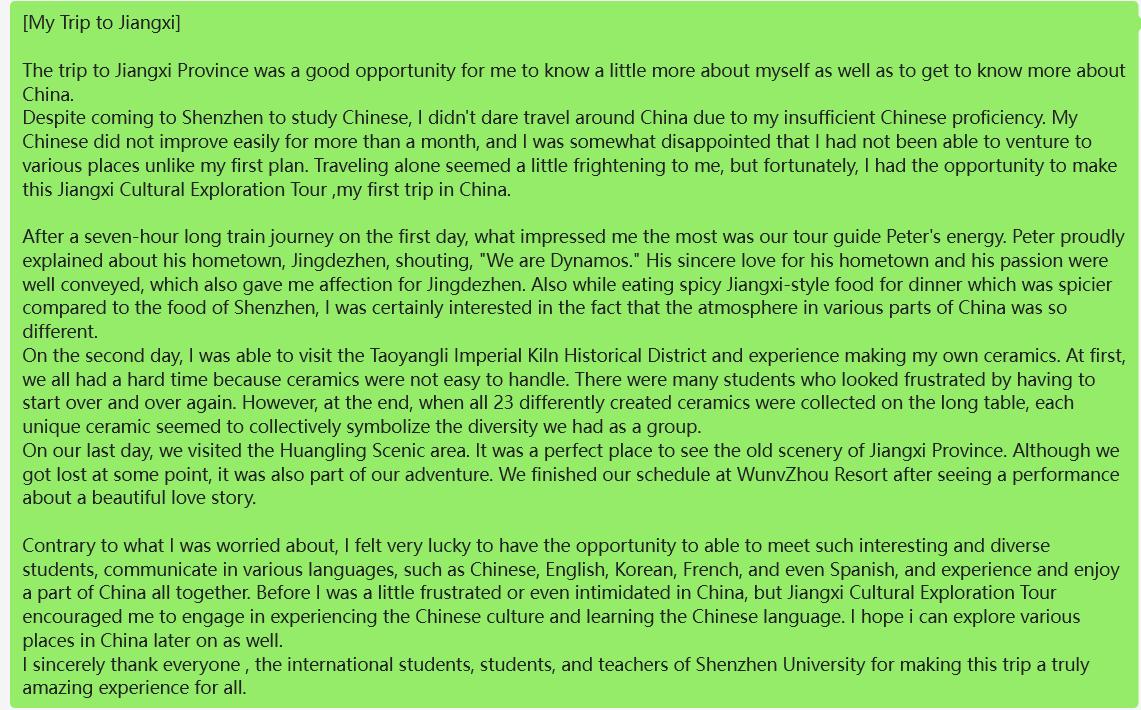 After the cultural journey, the students expressed their thoughts. They wrote down many heartfelt comments with great care. This journey was not only an exploration of culture, but also an exchange of hearts, allowing students from different cultural backgrounds to experience the charm of traditional Chinese culture together and enhance their understanding and identification with Chinese culture.