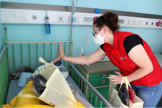 外國志愿者們說著流利的中文,一掃病房內緊張的氣氛,拉近了與小朋友之間的距離。有的小朋友非常友好,一見外國人就馬上從床上坐起來,伸手要和志愿者握手,嘴里還不忘用英語問候:“Hello!What is your name?” 有的孩子一接過禮物,迫不及待地把帽子戴在頭上,背起小書包在病房里得意地走起了臺步,在場的人都忍俊不禁。