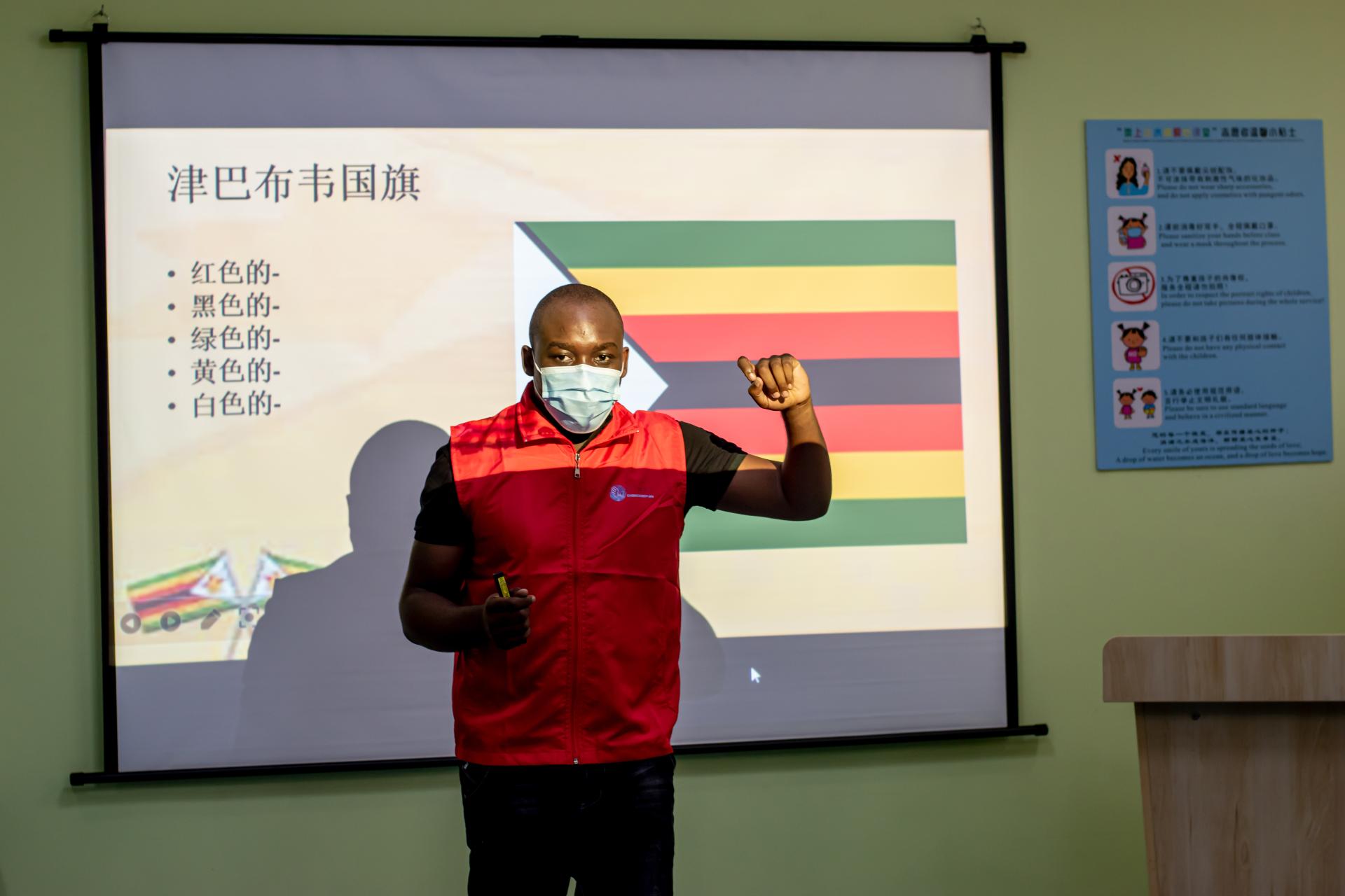伊世達先讓同學們觀察津巴布韋的國旗,鼓勵孩子們猜想國旗上不同的顏色所象征的意義。