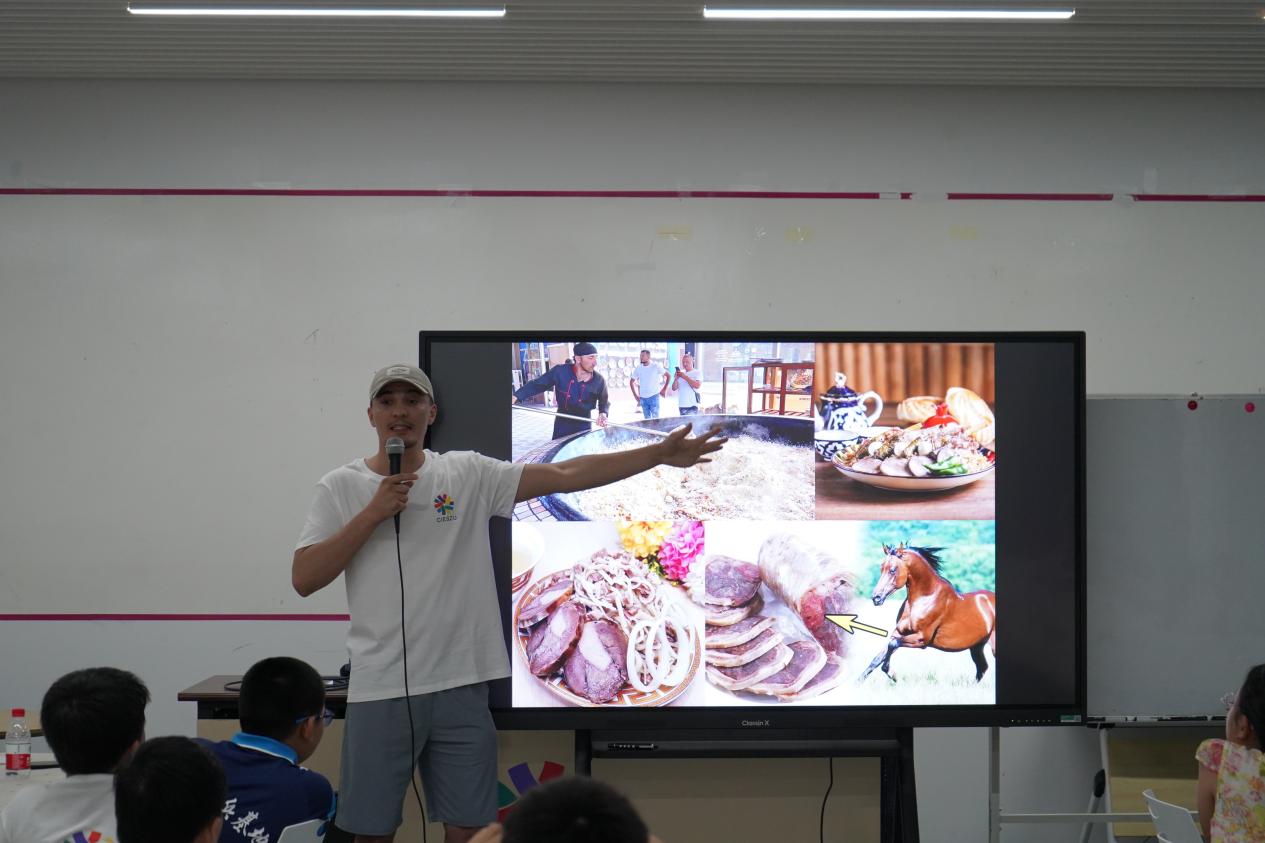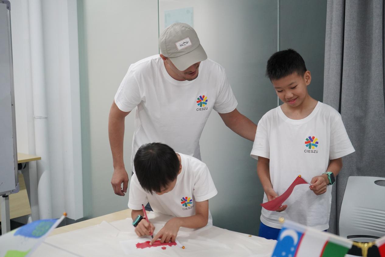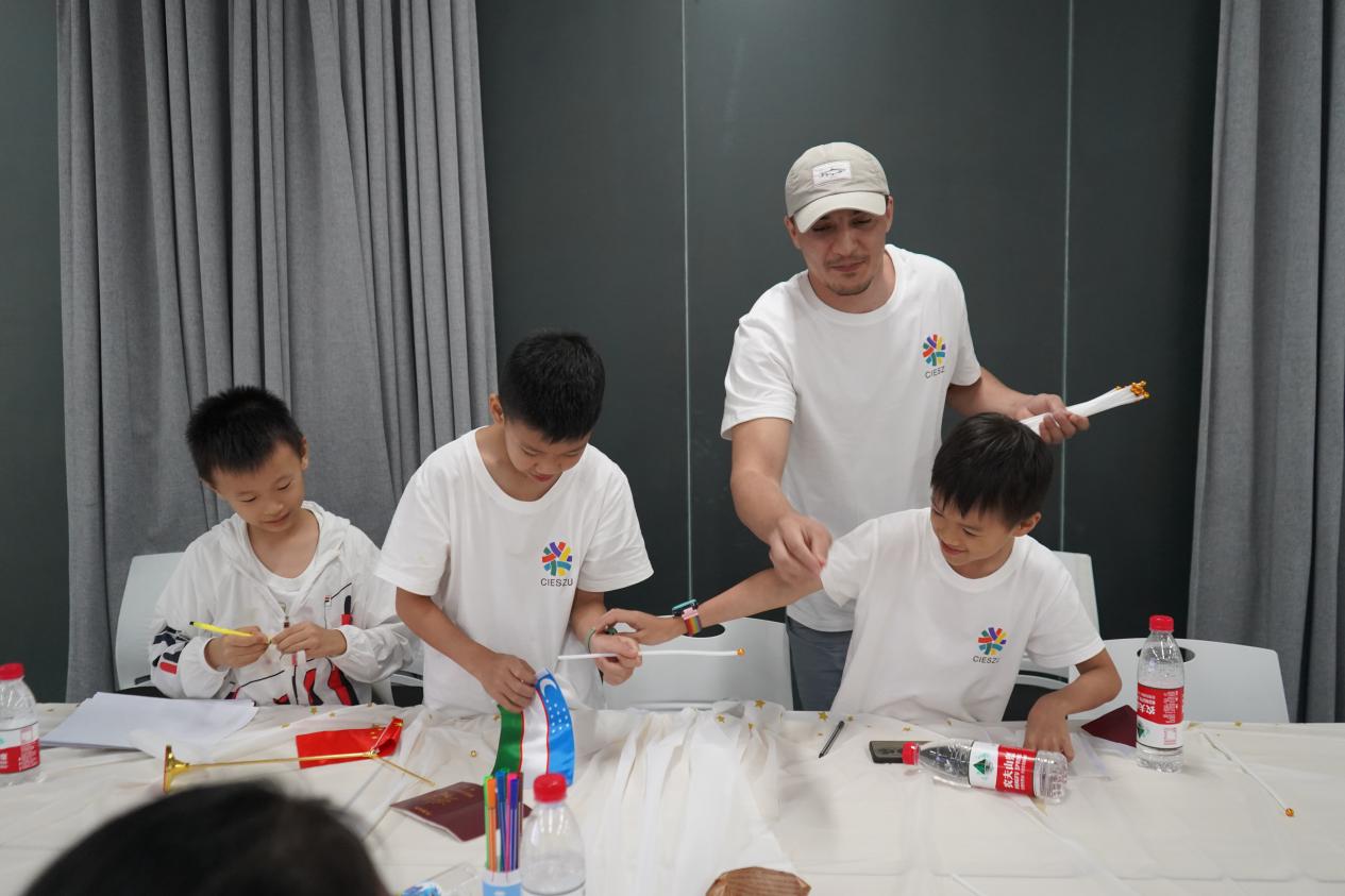 當撒馬爾罕、布哈拉、還有各類烏茲別克斯坦傳統美食呈現在小朋友眼前時,大家都非常驚喜。烏茲別克斯坦的湖山老師(PULATOV KHUSAN)準備了許多純白的小國旗,小朋友們在國旗上繪制中烏友誼,繪制世界大地圖,十分開心。