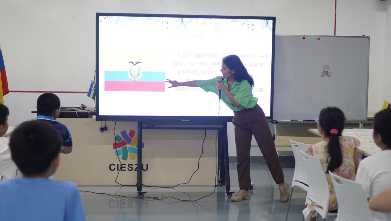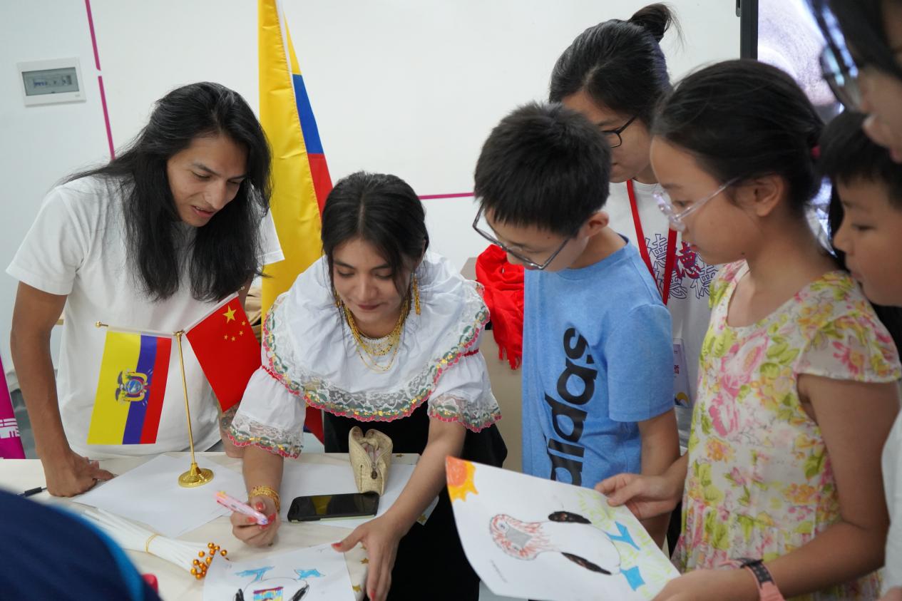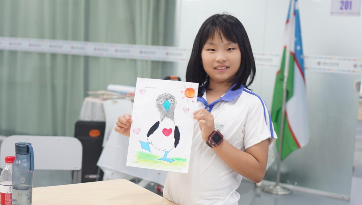 來自厄瓜多爾的艾莉老師(OLIVO BARZALLO GENESIS ELIZABETH)首先介紹了厄瓜多爾的特色風光和美食,然后搖身一變,身著民族特色服飾,帶領小朋友一起舞動,繞成圓圈跳起特色舞蹈。大家一起用油畫棒繪制出厄瓜多爾國鳥藍腿鰹鳥,小朋友們都開心地和大家分享自己的作品。
