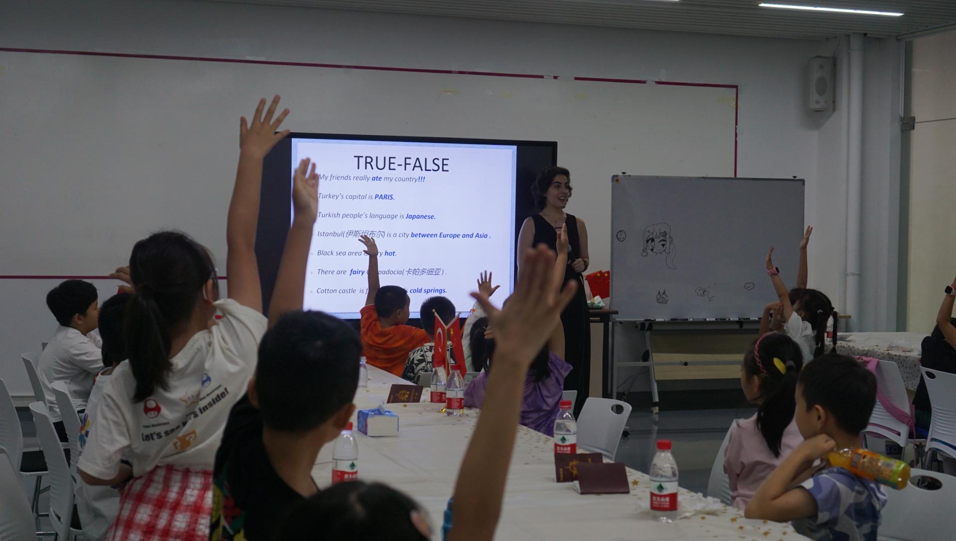 土耳其的阿詩瑪老師(TOPRAK ESMA)深受小朋友們的喜愛。在她充滿魅力的話語中,一幅描繪了“NAZAR BONCU?U”,鞋子小偷,土耳其熱氣球,洞房子的華麗畫卷在小朋友面前徐徐展開。通過阿詩瑪老師妙趣橫生的課堂,小朋友們對土耳其的文化和當地生活有了更生動形象的了解,課堂氣氛分外歡樂。
