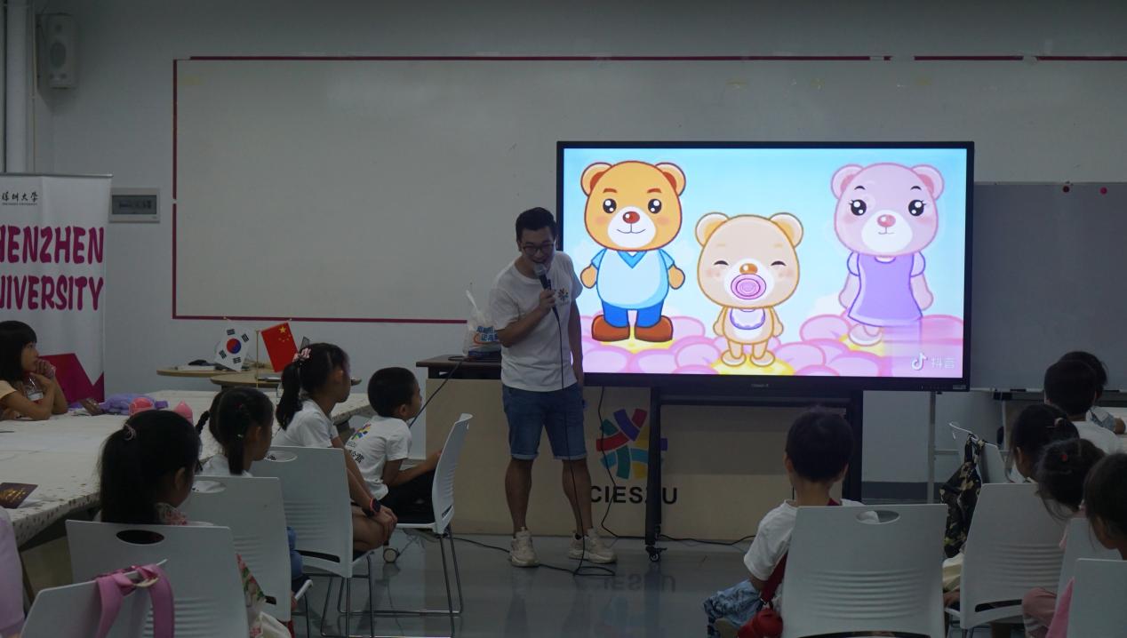 韓國的崔在佑老師(CHOI JAE WOO)在課上放起了活潑可愛的音樂——《三只小熊》。這首小朋友和家長都耳熟能詳的歌曲,在崔在佑老師將韓語版和中文版手勢舞的結合下,小朋友們跟隨大屏幕起舞,兩兩組隊,在快樂起舞中學習韓國文化和游戲,獲得屬于自己的獎勵。