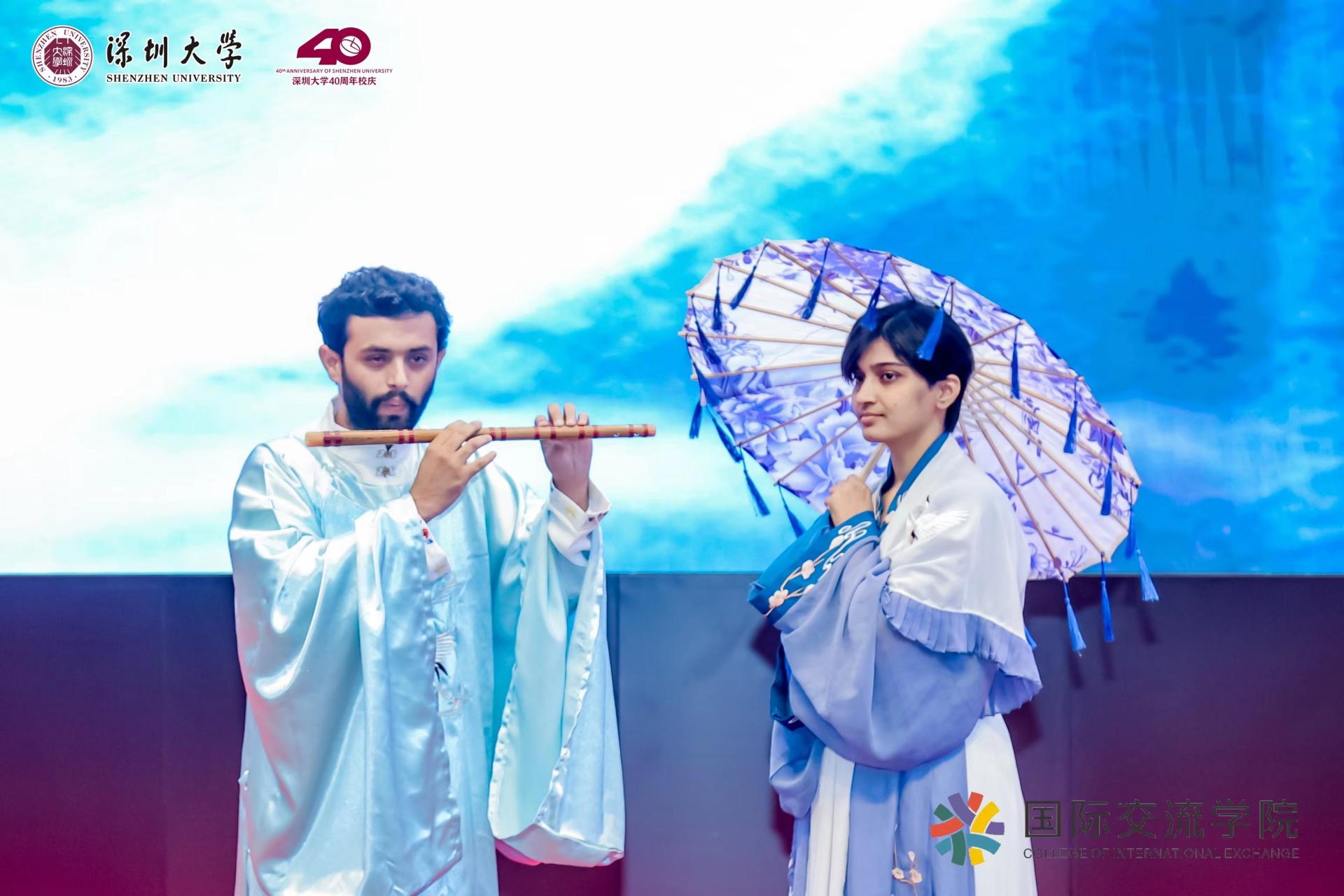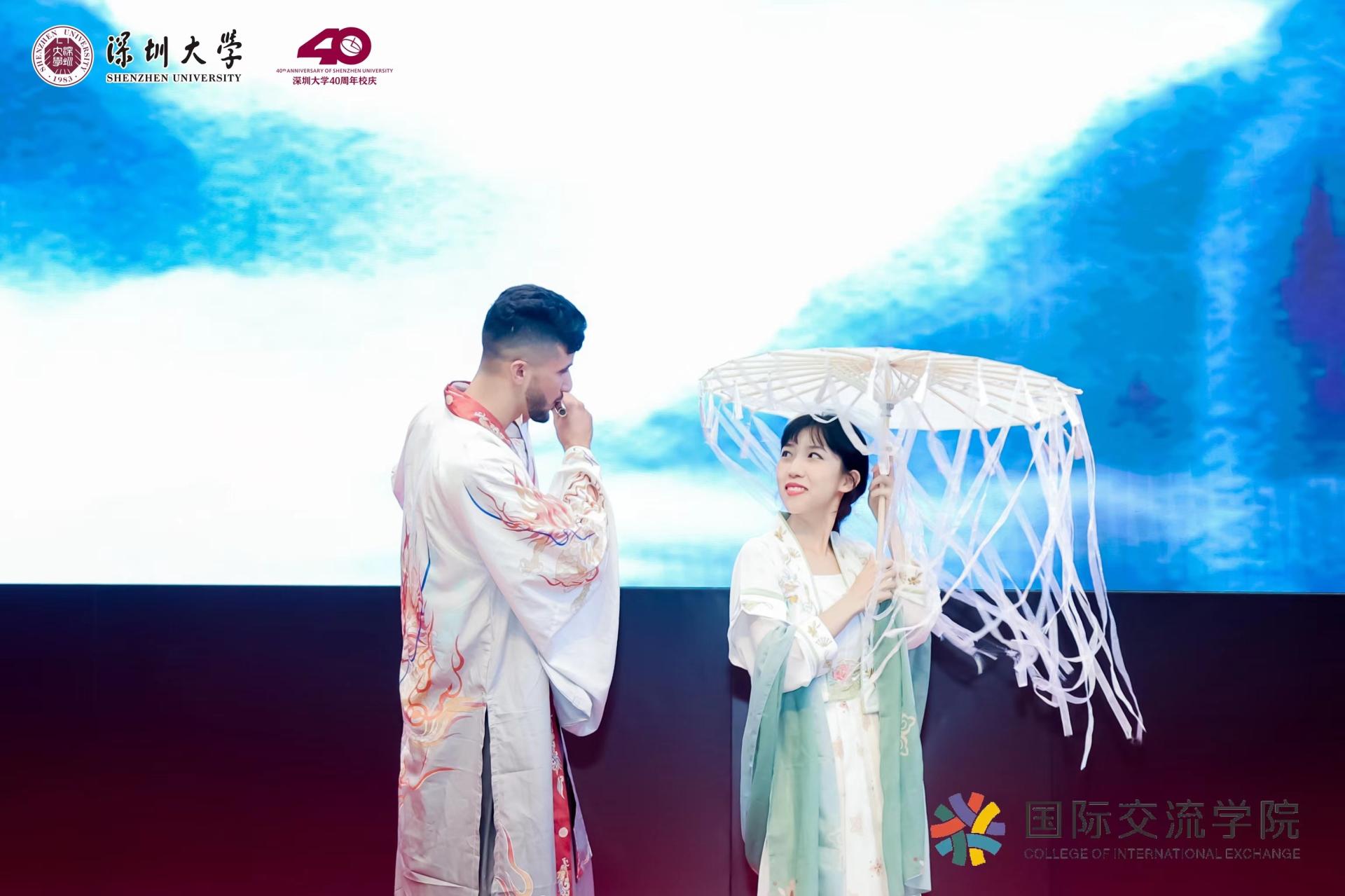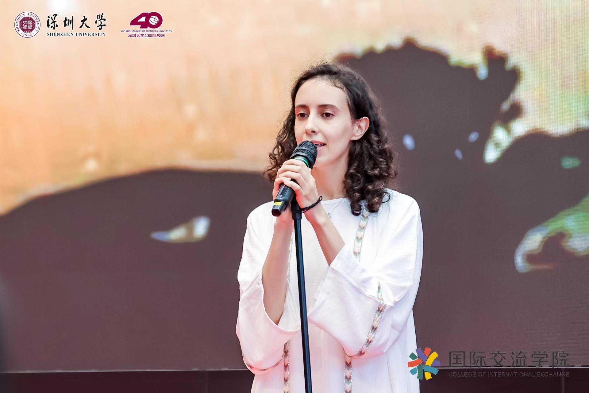 勁歌熱舞之后,來自摩洛哥的Sbai Imane(伊曼)用柔美的聲線將歌曲《Butterfly Fly Away》中溫暖的歌詞娓娓道來,配合吉他琴弦撥動,治愈人心。由GSC舞團帶來的舞蹈表演《畫卷》,將滿滿的中式元素融入到舞蹈之中,勾勒出一幅幅美麗的抒情畫卷。最后,深圳大學國際合唱團帶來獻禮深圳大學40周年校慶的合唱作品《南海之帆》,旋律優美、歌詞深情,表達了對母校的深沉熱愛和對未來的無限期許。