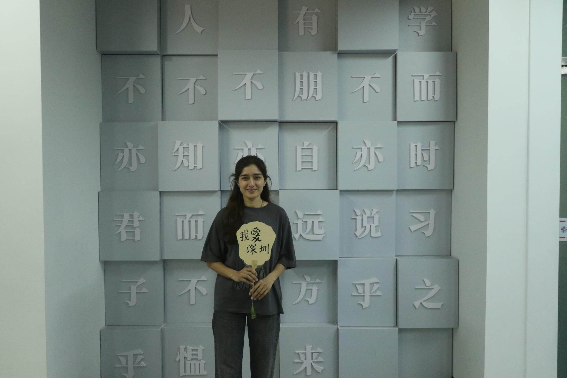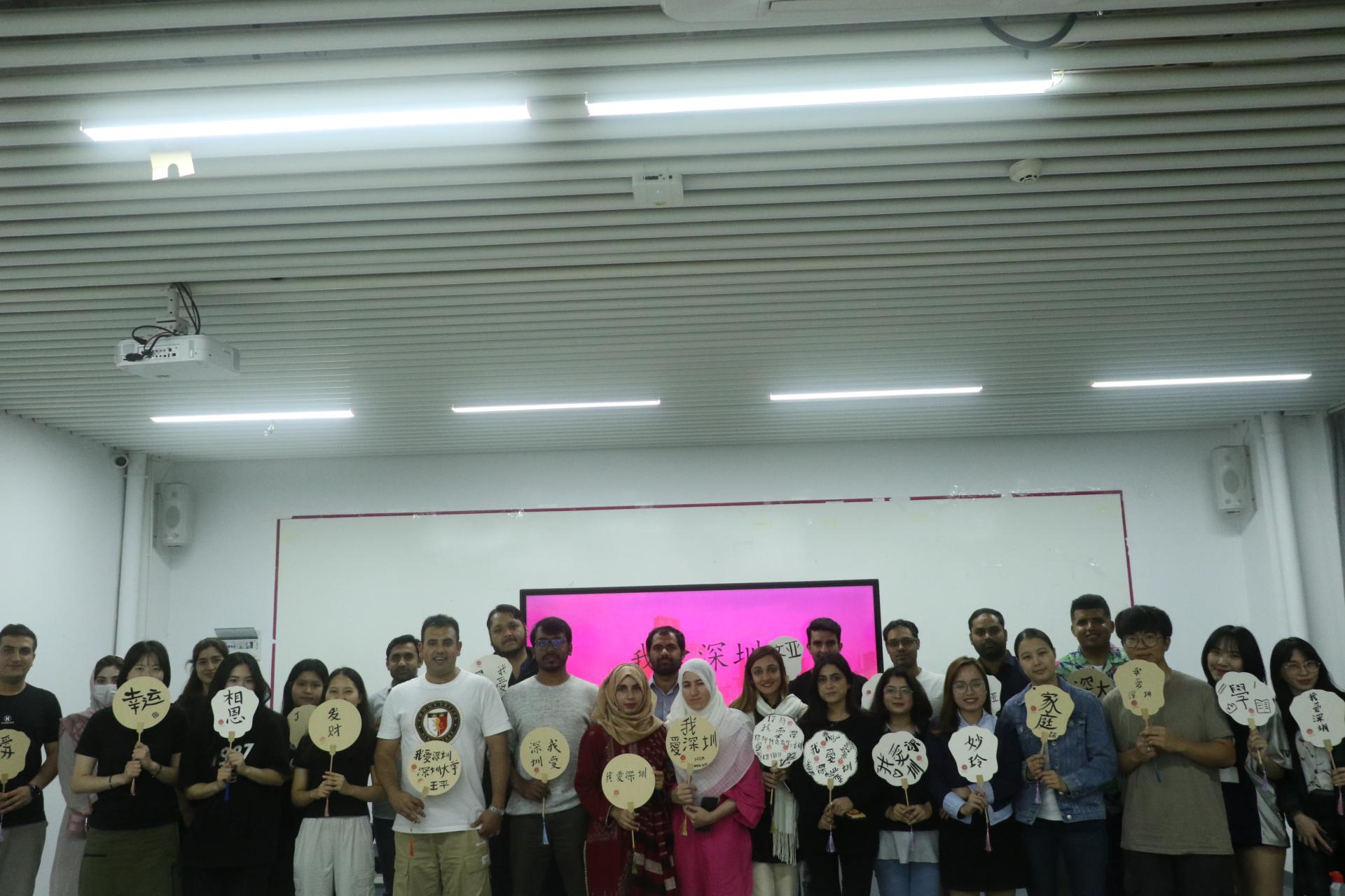 此次活動邀請了深圳大學書法社3名中國學生帶領國際學生學習和練習書法。書法社的中國學生先是介紹了書法的起源以及重要的發展歷程,隨后介紹了中國書法的文房四寶——筆、墨、紙、硯。對于書法的歷史,國際學生們聽得津津有味。緊接著,書法社的中國學生向國際學生認真講解了毛筆的握筆方式、毛筆的書寫方法等。不論是初次接觸書法的國際學生,還是已經有一定書法基礎的國際學生,都一步一步跟著書法社的中國同學從基本的筆畫開始練習,逐漸掌握了毛筆字書寫的基本技巧。國際學生先是在紙上進行練習,隨后在空白的扇子上揮毫潑墨寫上“我愛深圳”等漢字。