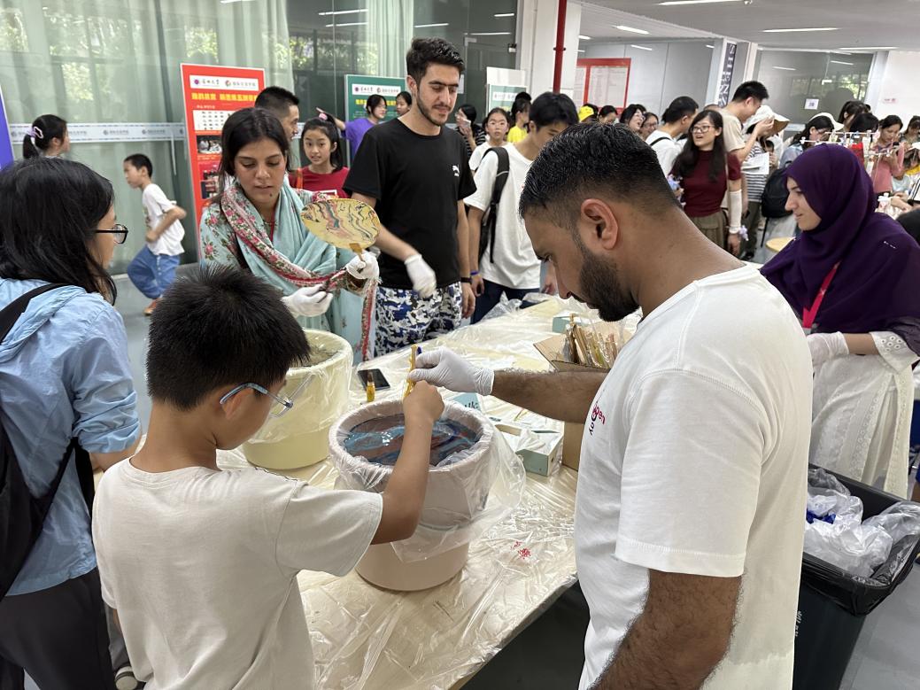 在漆扇制作區,來賓們與留學生同學們一起制作非遺漆扇。大家分享著對中國傳統非遺文化的熱愛,相互交流,彼此學習,用巧手將一片片普通的扇面,染上五彩斑斕的漆料和獨特的圖案。在歡聲笑語中,大家共同制作出了一把把精美的漆扇,為這次活動留下了難忘的回憶。