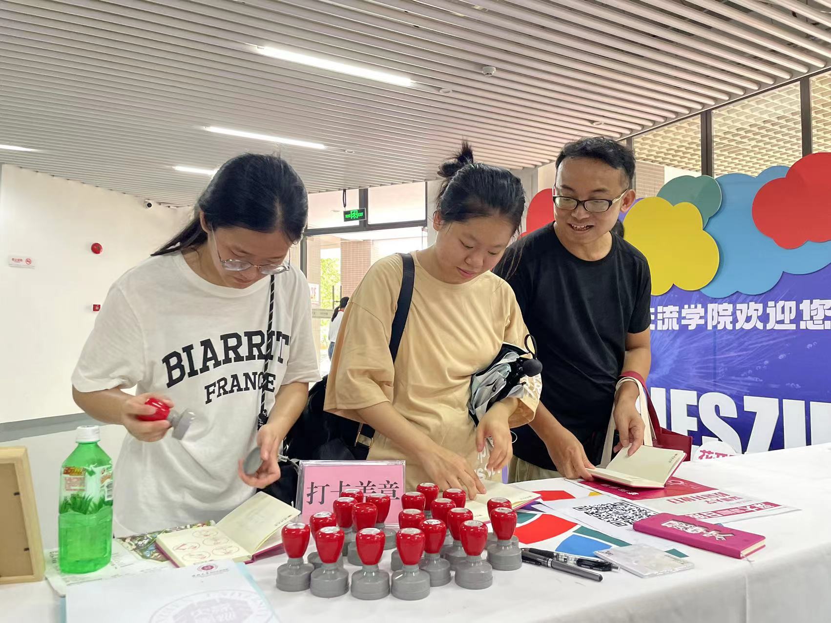 在打卡蓋章區,中外志愿者們熱忱地等待著每一位來賓,精心準備了學院院徽和文化衫等精美紀念品。來賓可以在打卡點留下美好瞬間,還有機會獲得國際文化節特色國家貼紙和印章。學院打卡點還特別為高考生準備了深大特色文創產品,讓每一位參與者都滿載而歸,心中充滿驚喜與成就感。