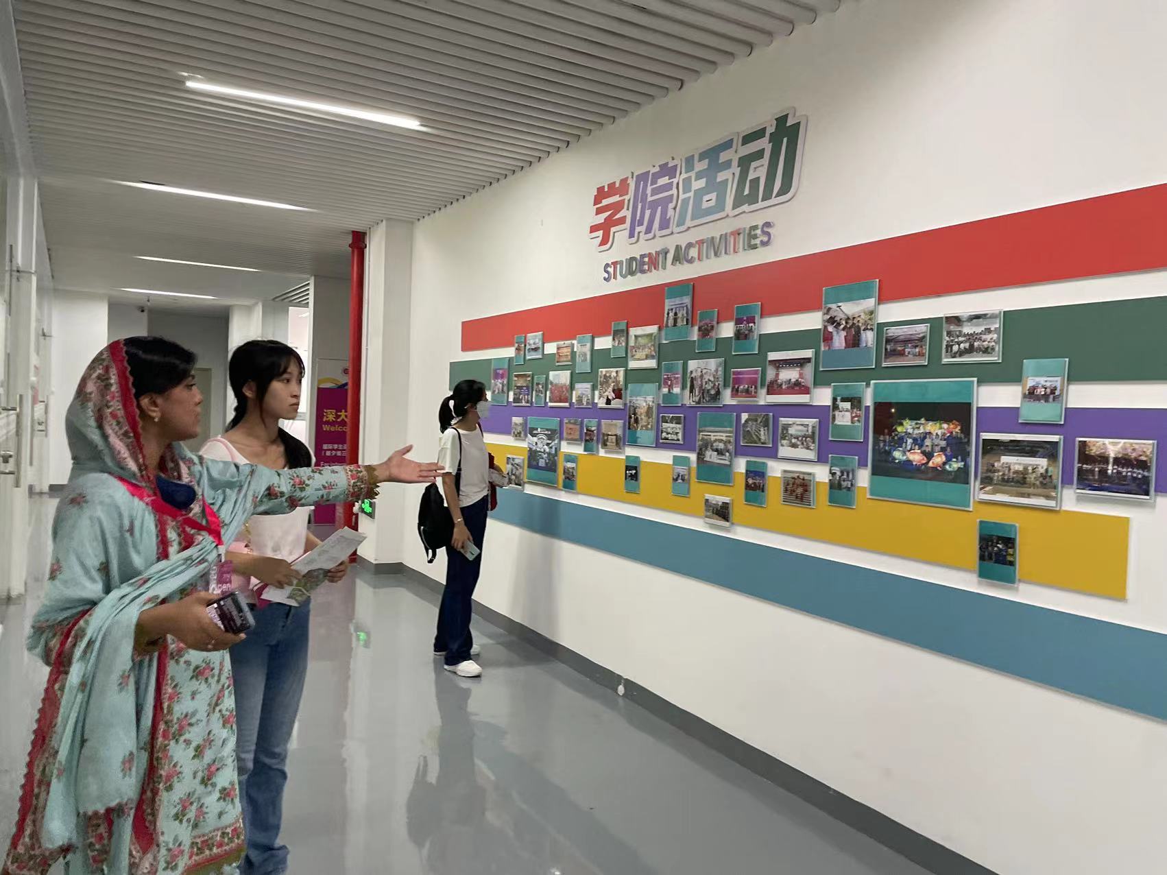學院參觀區志愿者們引領來賓們環繞二樓,一邊漫步于學院之中,一邊娓娓道來學院的發展歷程和獨特的辦學特色。在參觀過程中,來賓們被留學生笑臉墻、茶藝室和學生活動照片墻等展區所吸引,深深地感受到了國際交流學院的活力與多元。