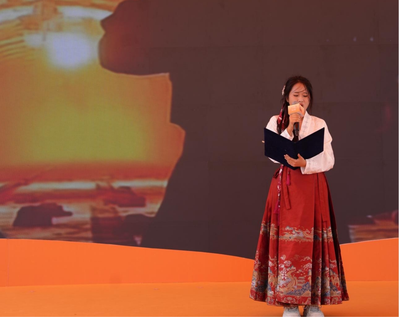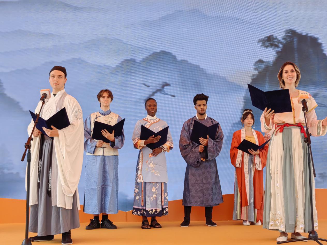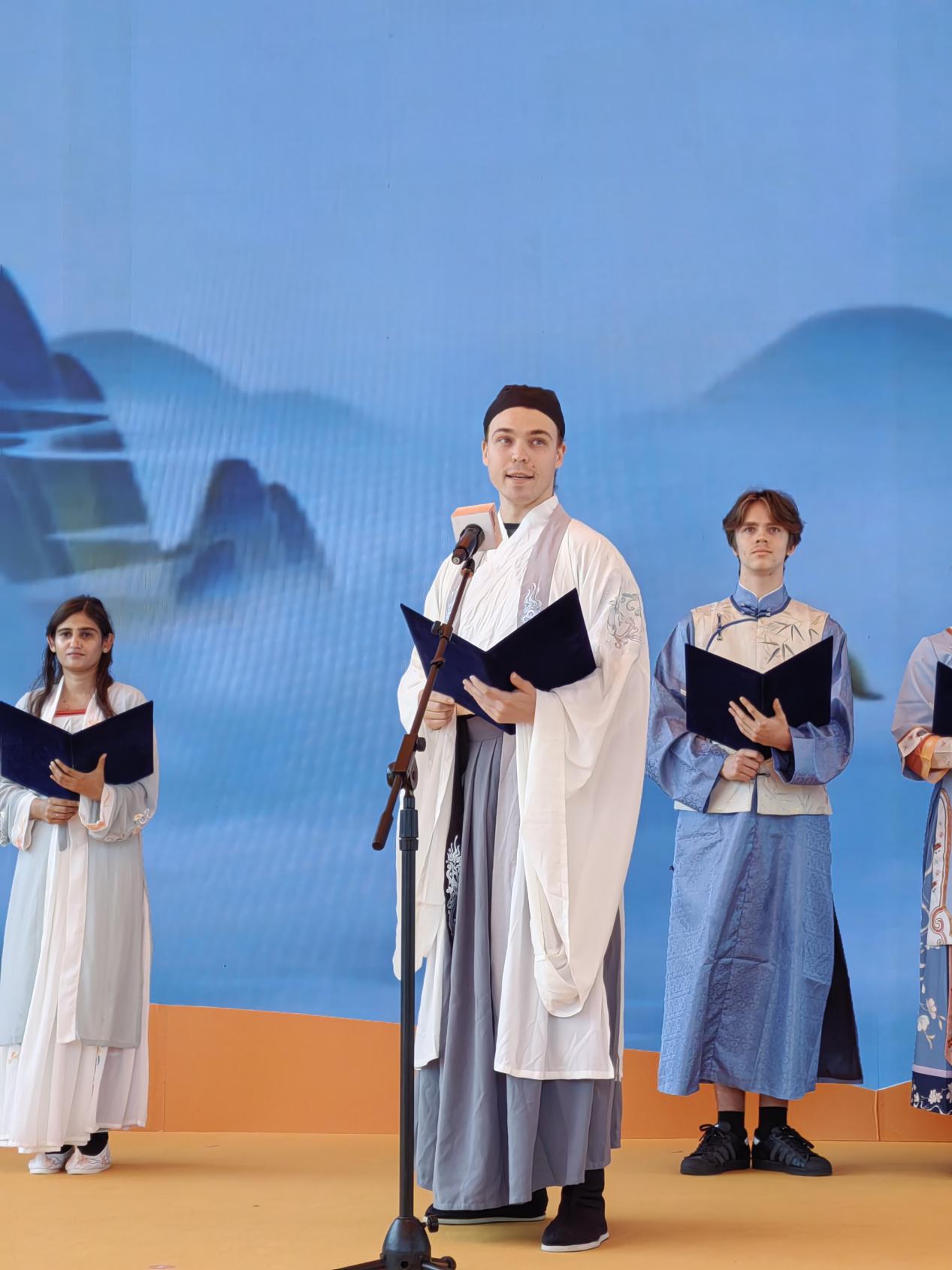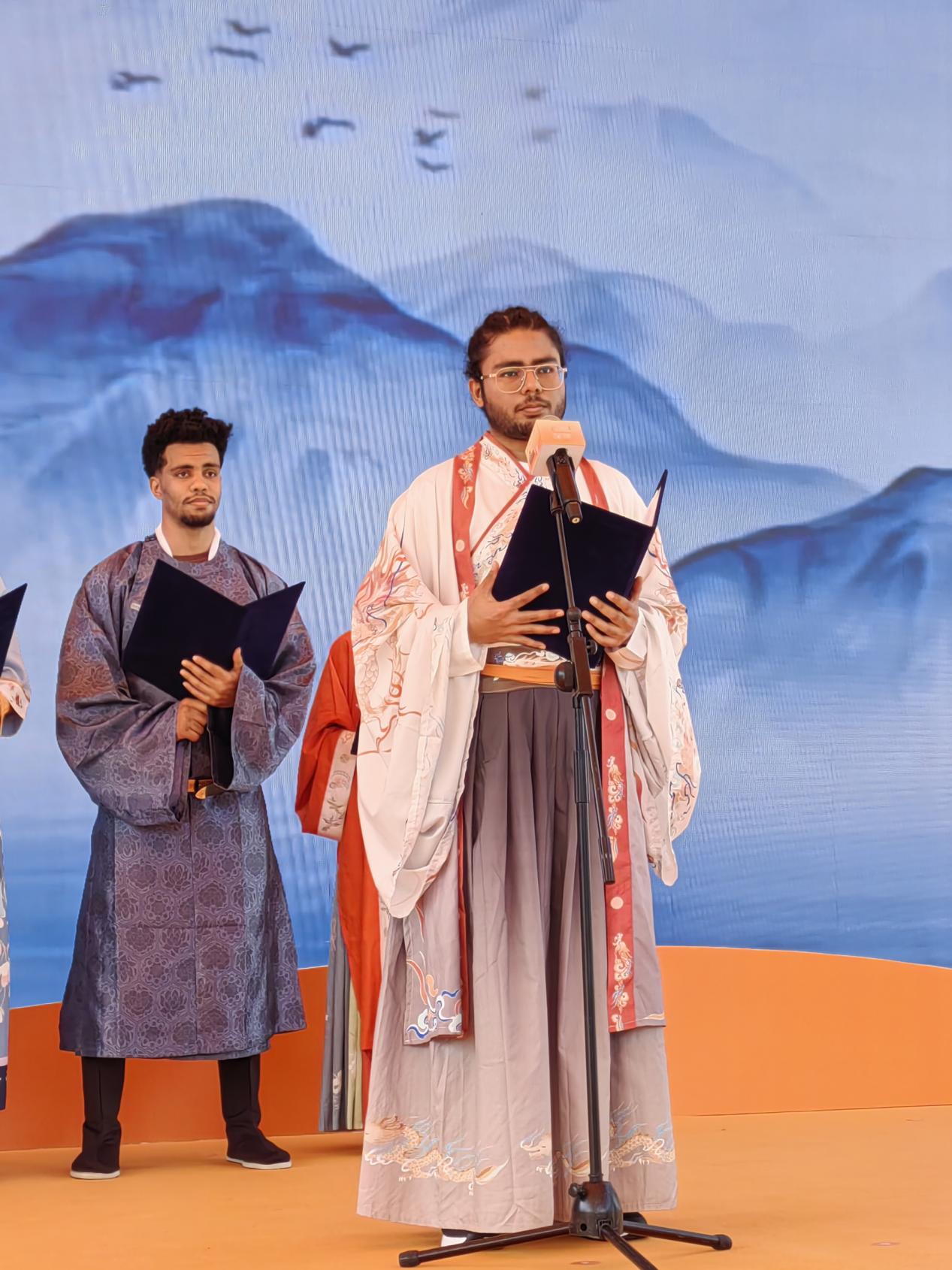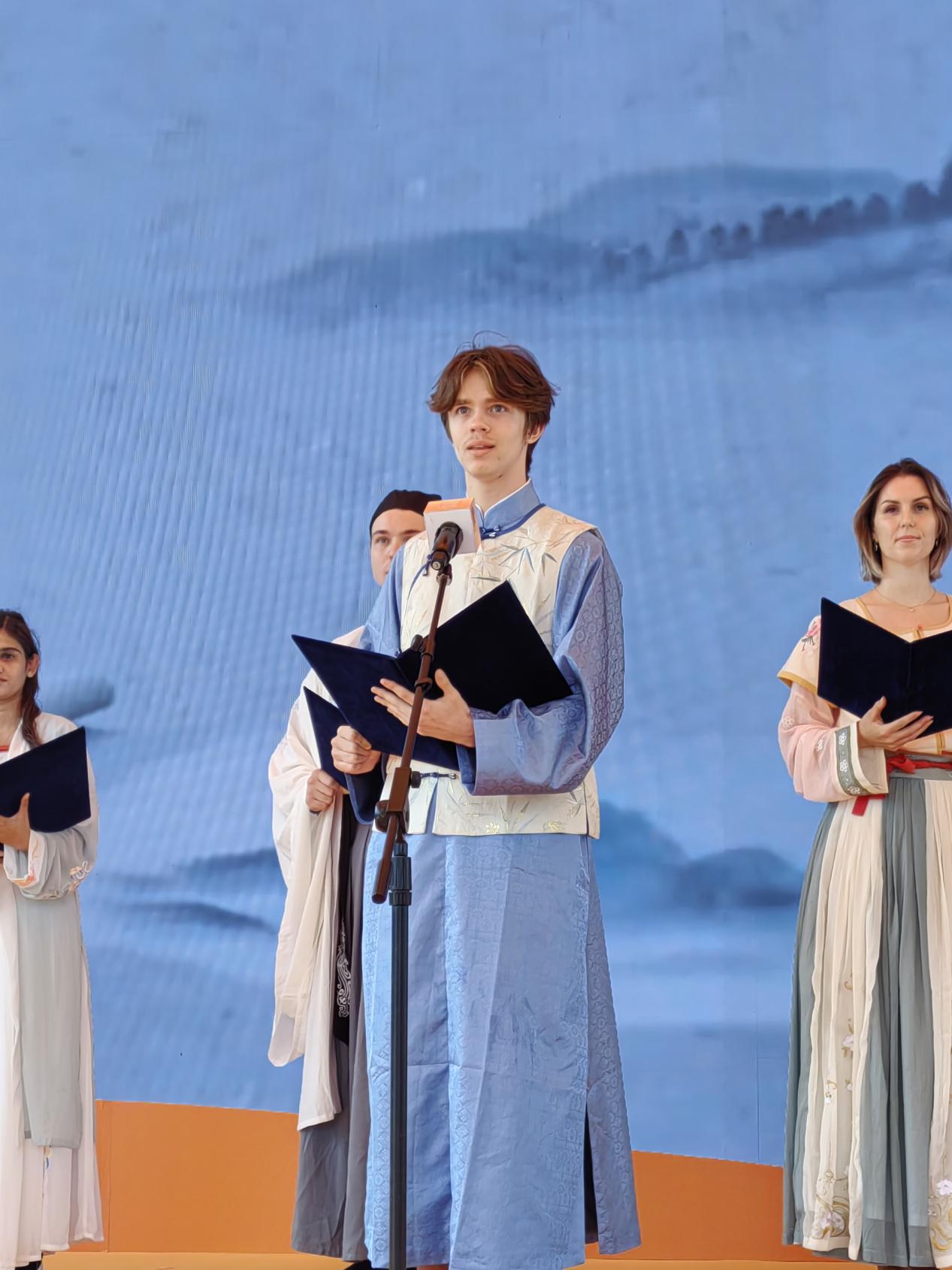 在水幕廣場的燈光下,來自尼日爾、巴基斯坦、俄羅斯等9個國家的10位留學生身著傳統漢服,如同從古代畫卷中走出的詩人,深情地演繹了一系列中華經典詩歌。一首首古詩在他們的誦讀中煥發出別樣的魅力,如同春日的花開,夏日的清風,秋日的落葉,冬日的暖陽,每一種細膩的情感都在他們的誦讀中得到了完美的詮釋。他們的聲音和漢服的飄逸,共同展現了“書香能致遠,詩書氣自華”的境界,讓人置身于一個充滿詩意的世界,感受到了中華文化的無窮魅力和深遠影響。