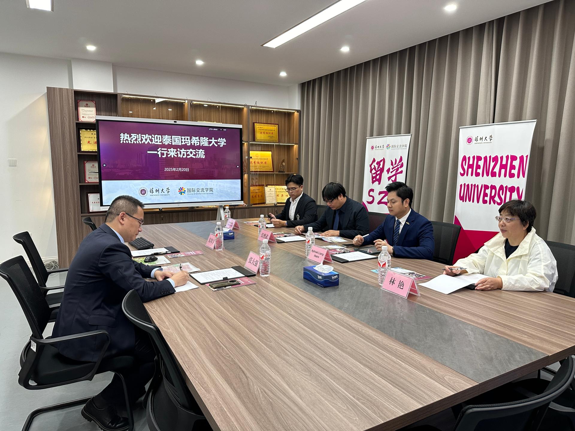 2025年2月20日,泰國瑪希隆大學孔子學院中方院長林艷、外方院長張曹武攜人文學院院長Aphiwit Liang等一行訪問深圳大學國際交流學院。深圳大學國際交流學院副院長張大強、招生專員夏填宇出席會談,雙方就推薦學生、學術合作等達成共識。