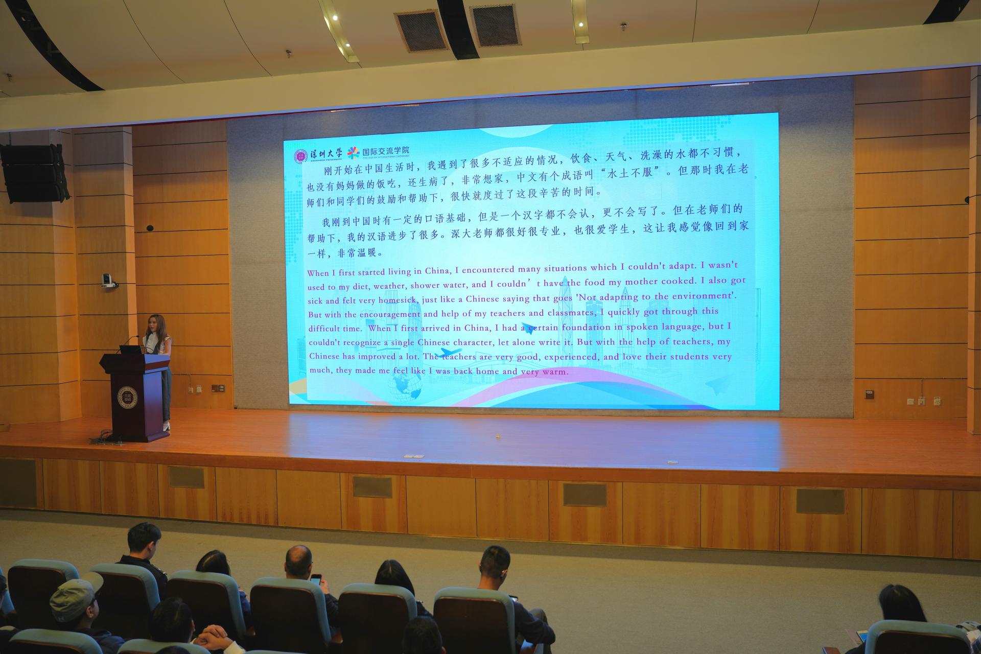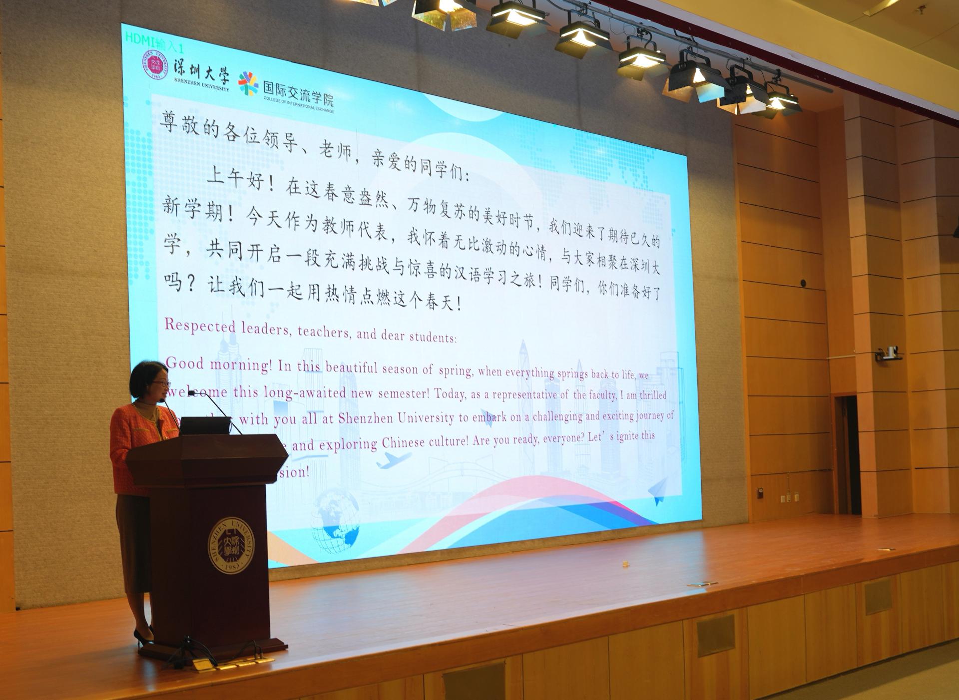緊接著,侯小艷老師作為教師代表發言,她以幽默方式介紹漢語發音趣味,同時強調了深圳及深圳大學的獨特魅力,并鼓勵留學生積極參與漢語學習和文化活動,結交國際友人,相信他們定能克服困難,在深圳大學收獲知識、友誼與成長,書寫屬于自己的精彩篇章。