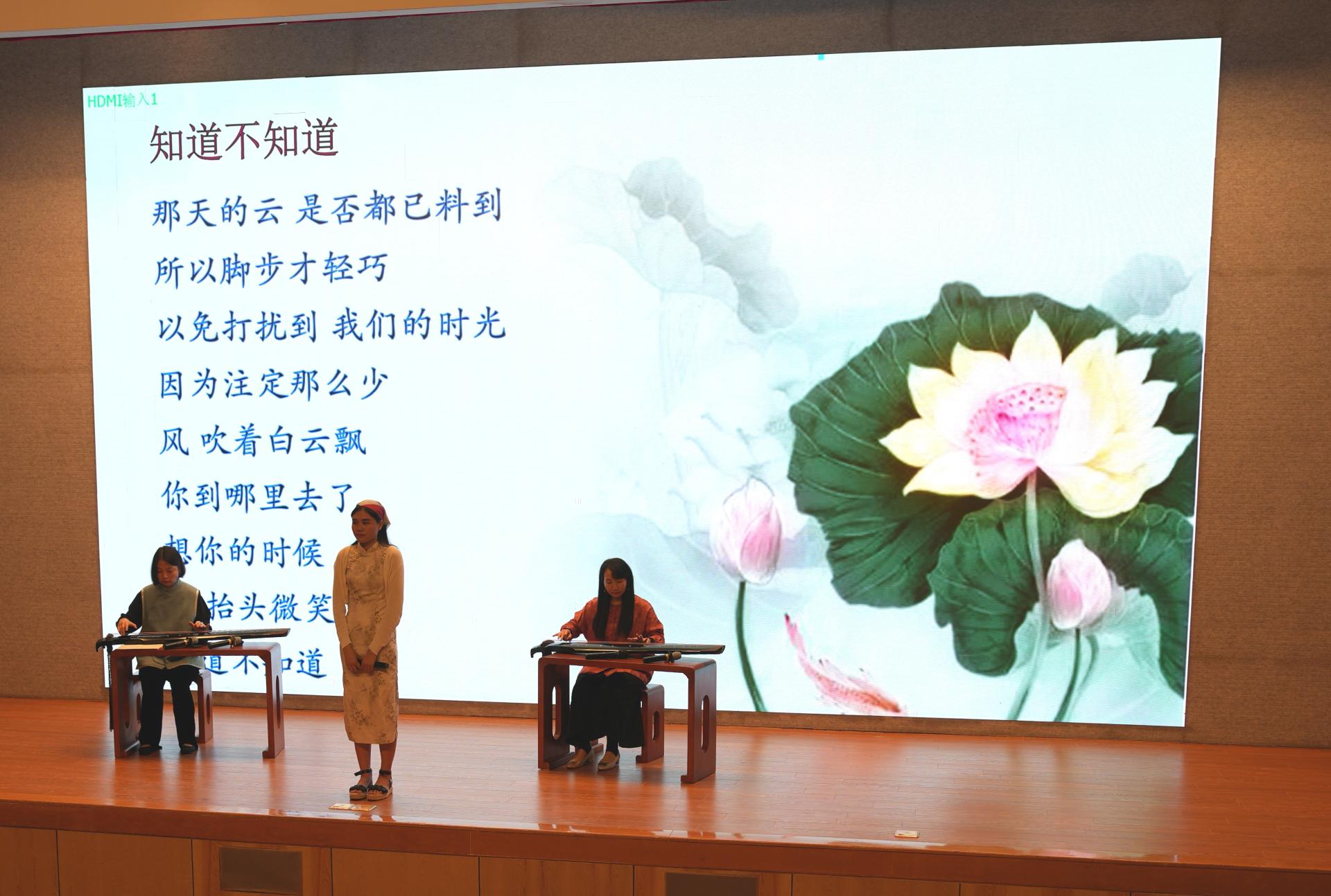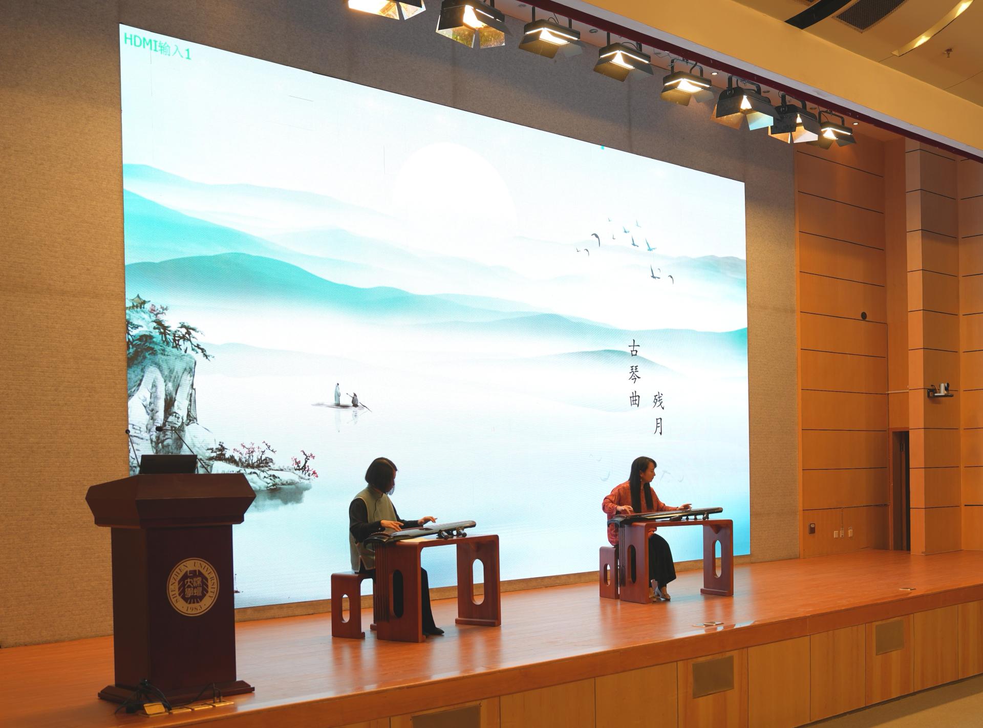 典禮開始是師生聯袂呈現的古琴伴唱《知道不知道》,悠揚的古琴聲與清澈婉轉的歌聲交相輝映,仿佛山間清泉流淌,滌蕩著每一位觀眾的心靈,帶來一種超越時空的寧靜與深邃。緊接著,古琴二重奏《殘月》將現場氛圍推向高潮,琴聲如泣如訴,仿佛訴說著千年歷史的滄桑與凄美,觀眾們屏息凝神,深深沉浸在這老而動人的旋律之中,感受著中華文化的深厚底蘊。