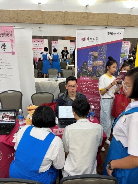 深圳大學(xué)國際交流學(xué)院招生專員曾文婷、夏填宇代表學(xué)校參展,針對有意來華留學(xué)的馬來西亞學(xué)生系統(tǒng)闡述我校的專業(yè)優(yōu)勢、校園環(huán)境、招生政策等內(nèi)容,耐心解答學(xué)生關(guān)心的話題,同時也向咨詢的學(xué)生發(fā)出了熱情邀請。我校展區(qū)咨詢隊列綿延,互動問答間洋溢著活躍融洽的氣氛。